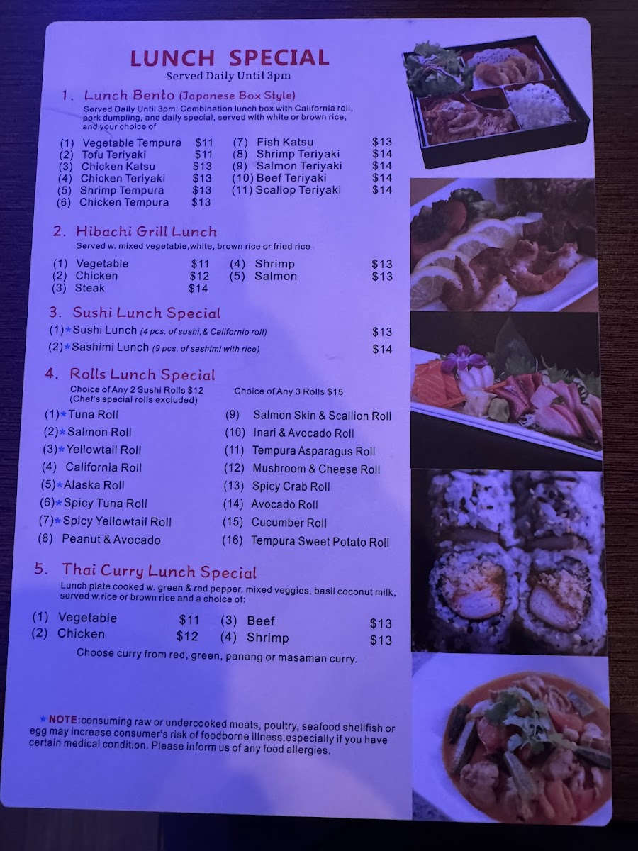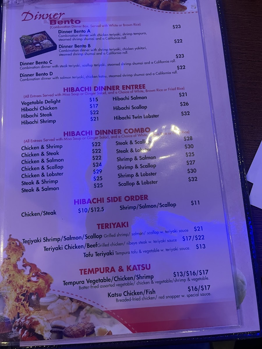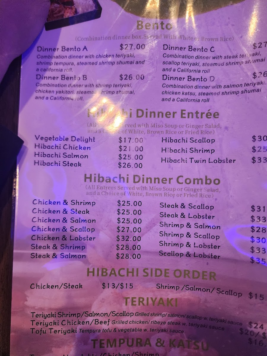 Hibachi scallop served with miso soup or ginger salad, and choice of white, fried, or brown rice.